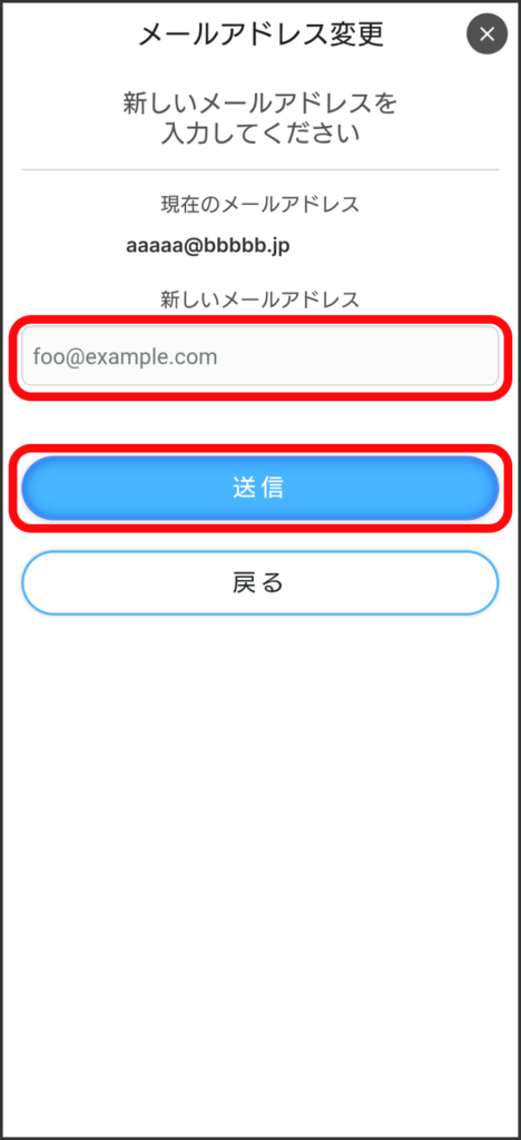 4.新しいメールアドレスを入力し、「送信」をタップ