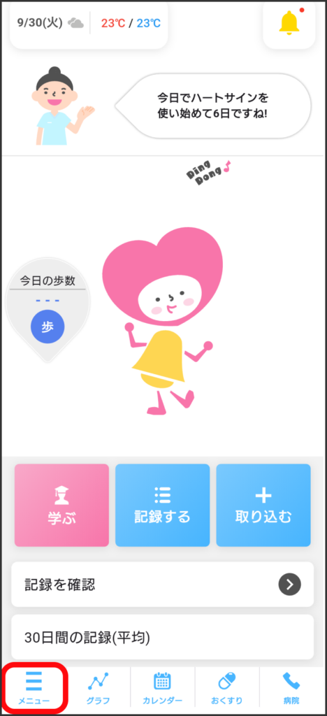 1.「ハートサイン」アプリを起動し、「メニュー」をタップ