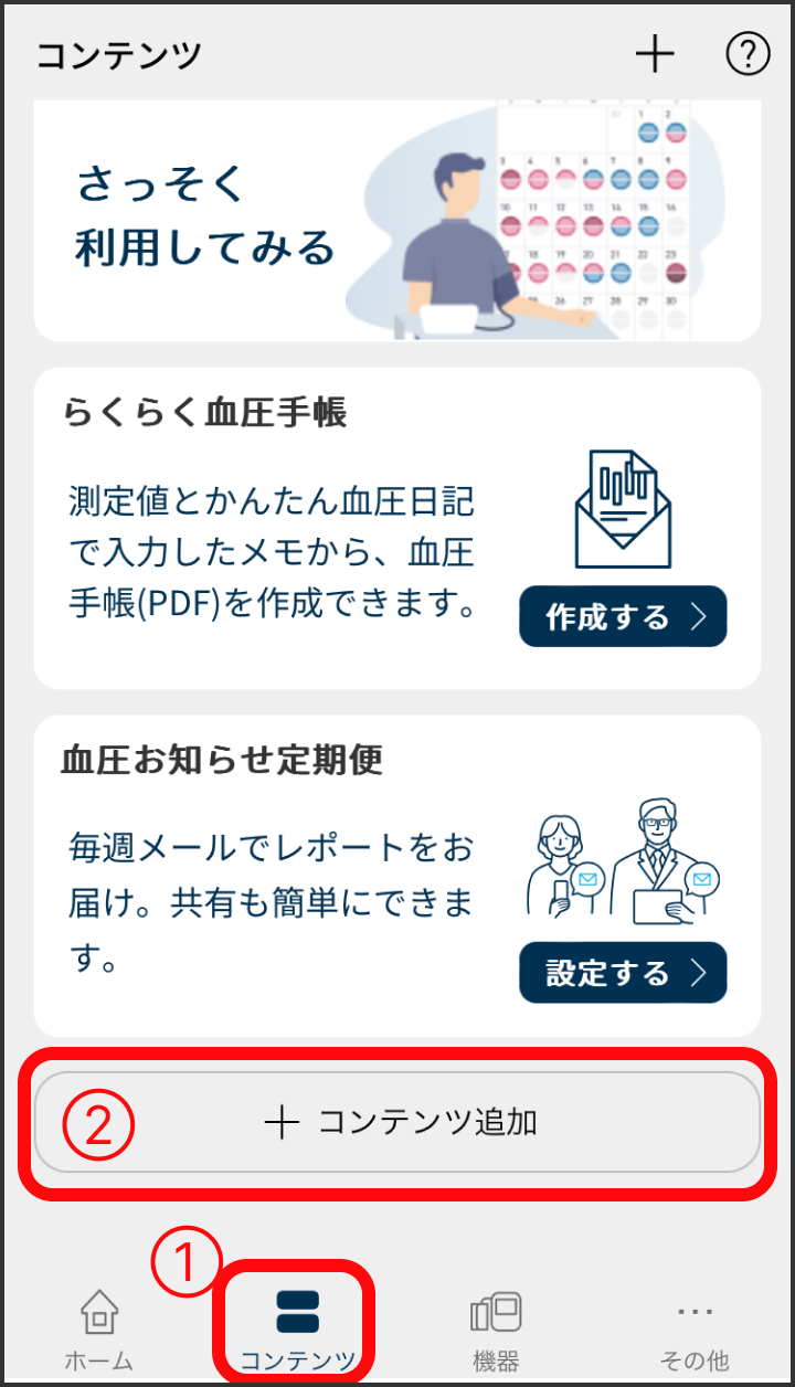 1.OMRONconnectホーム画面下部にある①「コンテンツ」をタップし、コンテンツ画面の