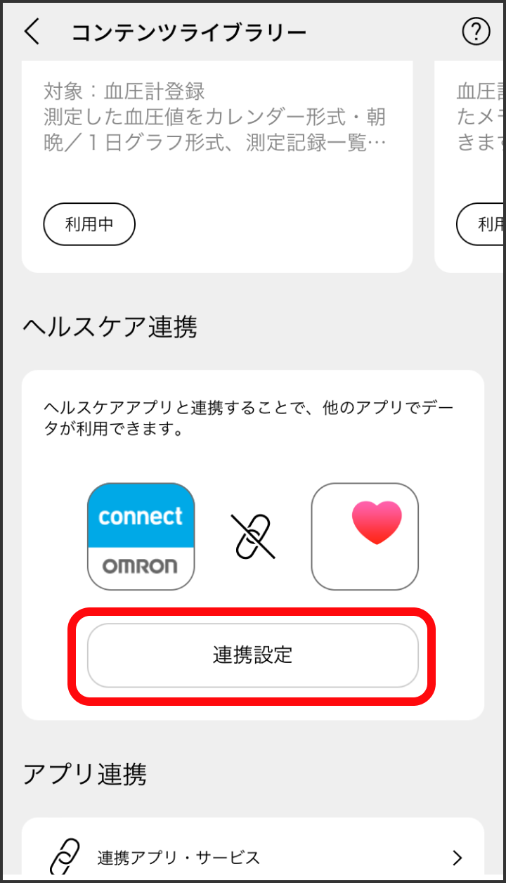 2.コンテンツライブラリー内にある「ヘルスケア連携」の「連携設定」をタップ