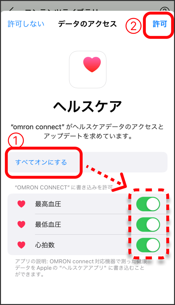 4.データのアクセスを許可します。①「すべてオンにする」をタップするとすべての項目がオンになります。設定後、右上の②「許可」をタップし、連携完了
