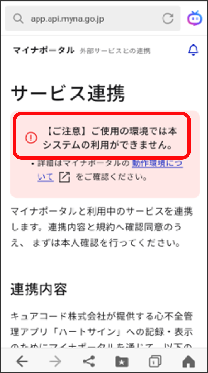 マイナポータルの画面(下の画像)で、「この環境では利用できません」と表示された場合は、「設定」アプリからデフォルトのブラウザをChromeに変更してください