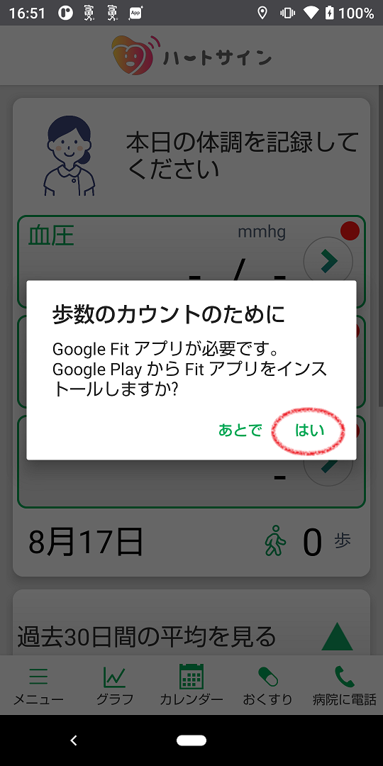 1. Android 版のハートサインを起動すると「歩数カウントのために Google Fit アプリが必要です。Google Play から Fit アプリをインストールしますか?」と聞かれることがあります。「はい」を選択してください。