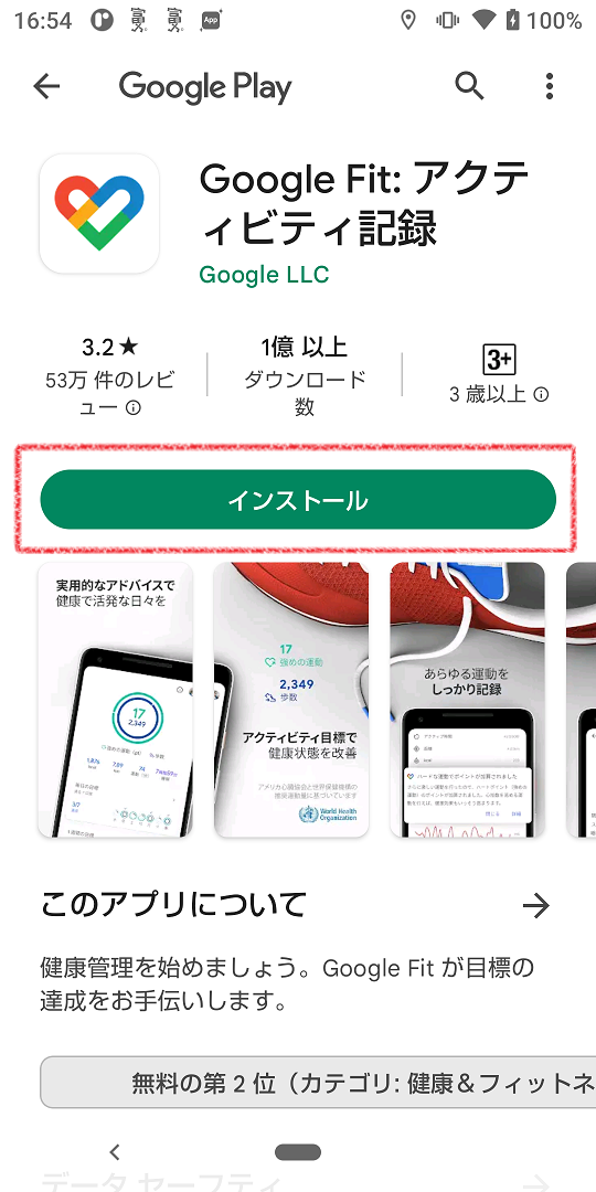 ハートサインでは歩数の計測などに Google Fit アプリが必要ですので、まだインストールされていない場合はインストールをお願いします。