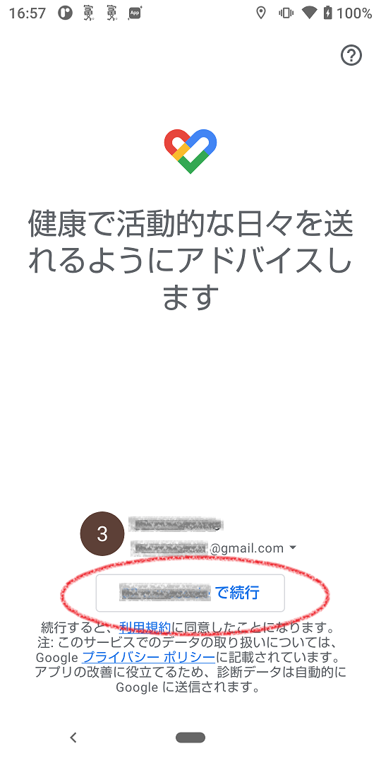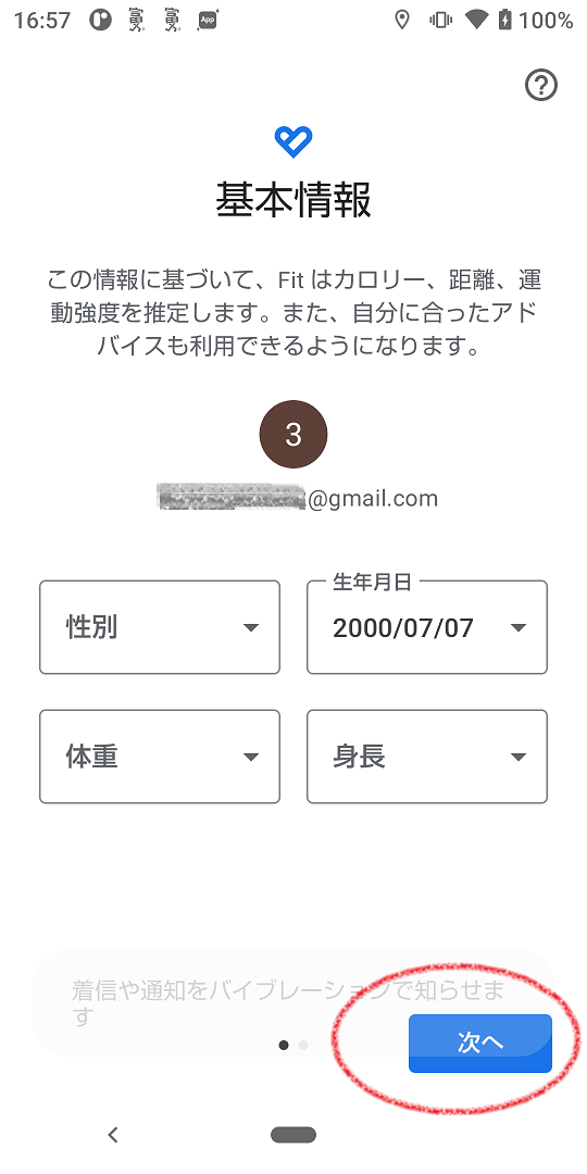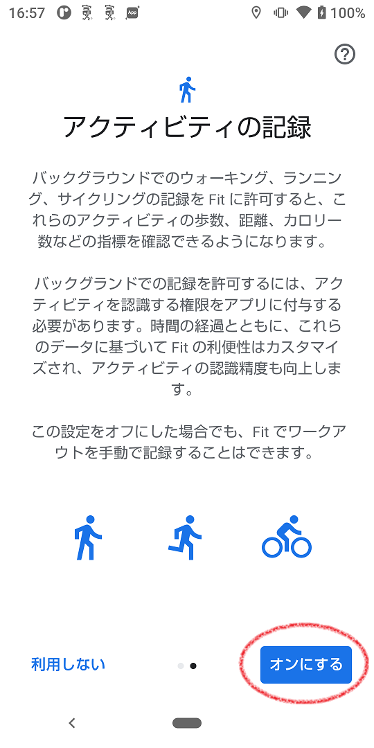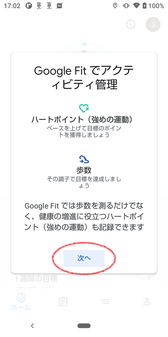 7. Google Fit でアクティビティの管理という画面が出たら「次へ」を押していって「完了」してください。