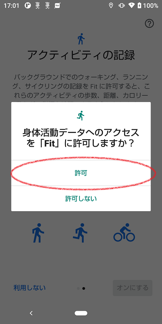 6. 身体活動データへのアクセスを「Fit」に許可してください。